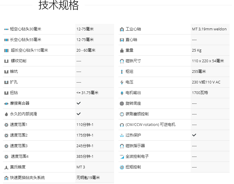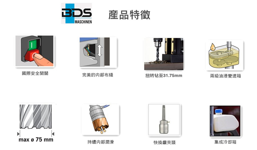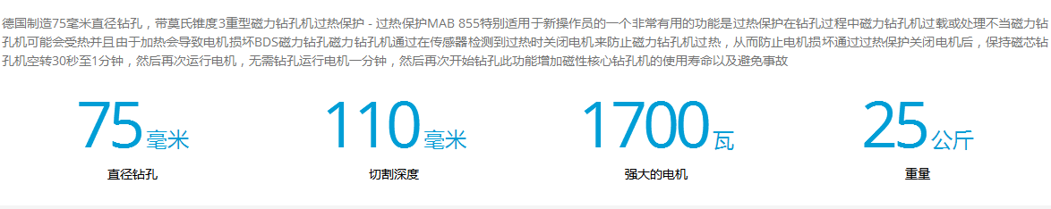 介紹:德國制造75毫米直徑鉆孔,帶莫氏錐度3重型磁力鉆孔機過熱保護 - 過熱保護MAB 855特別適用于新操作員的一個非常有用的功能是過熱保護在鉆孔過程中磁力鉆孔機過載或處理不當磁力鉆孔機可能會受熱并且由于加熱會導致電機損壞BDS磁力鉆孔磁力鉆孔機通過在傳感器檢測到過熱時關閉電機來防止磁力鉆孔機過熱,從而防止電機損壞通過過熱保護關閉電機后,保持磁芯鉆孔機空轉30秒至1分鐘,然后再次運行電機,無需鉆孔運行電機一分鐘,然后再次開始鉆孔此功能增加磁性核心鉆孔機的使用壽命以及避免事故