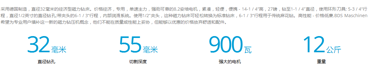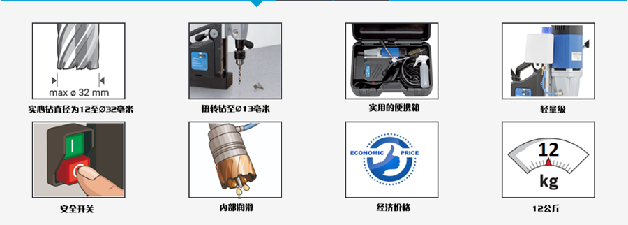 介紹:采用德國制造,直徑32毫米的經濟型磁力鉆床。價格經濟,專用,單速主力,強勁可靠的8.2安培電機,緊湊,輕便,便攜 - 14-1 / 4“高,27磅,鉆至1-1 / 4”直徑,使用環形刀具; 5-3 / 4“行程,直徑1/2英寸的直徑鉆孔;帶夾頭的6-1 / 3“行程,內部潤滑系統。使用1/2”夾頭,這種磁力鉆床可輕松轉換為標準鉆床,6-1 / 3“行程用于傳統麻花鉆。高性能 - 價格低廉.BDS Maschinen希望為專業用戶填補這一新的磁力鉆壓機概念,他們不能在質量或性能上妥協,但能夠以優惠的價格放棄舒適和配件。