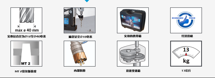 介紹:德國制造的40毫米直徑鉆孔能力與莫氏錐度2經濟型磁力鉆。 10.5安培雙絕緣電機,MT2 - “3/4”直接心軸,帶自動冷卻功能。使用環形切割器,最大直徑為3/4“的Twist鉆孔;帶夾頭的6-1 / 3“行程,帶3/4”夾頭,MABasic 450磁力鉆可輕松轉換為標準鉆床,傳統麻花鉆具有6-1 / 3“行程.ProfiBASIC:高性能 - 低BDS Maschinen希望為專業用戶填補這一新型磁力鉆機概念的空白,這些用戶不能在質量或性能上妥協,但能夠以優惠的價格放棄舒適性和配件。