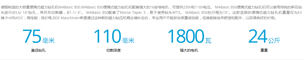 介紹:德國制造的大容量便攜式磁力鉆孔機MABasic 850.MABasic 850便攜式磁力鉆孔機配備強大的16安培電機,可提供230V和110V電壓。 MABasic 850便攜式磁力鉆孔機可以使用傳統的麻花鉆頭進行?3.6/ 16“鉆孔,帶環形切割器,?1-1/ 4”。 MABasic 850配備了Morse Taper 3,易于使用鉆頭MT3。 MABasic 850的行程為10“。這款堅固的便攜式磁力鉆孔機重量僅為53磅.ProfiBASIC:高性能 - 低價格.BDS Maschinen希望通過這種新的磁力鉆壓機概念填補空白,專業用戶不能妥協質量或性能,但誰能夠放棄舒適和配件,以獲得良好的價格。